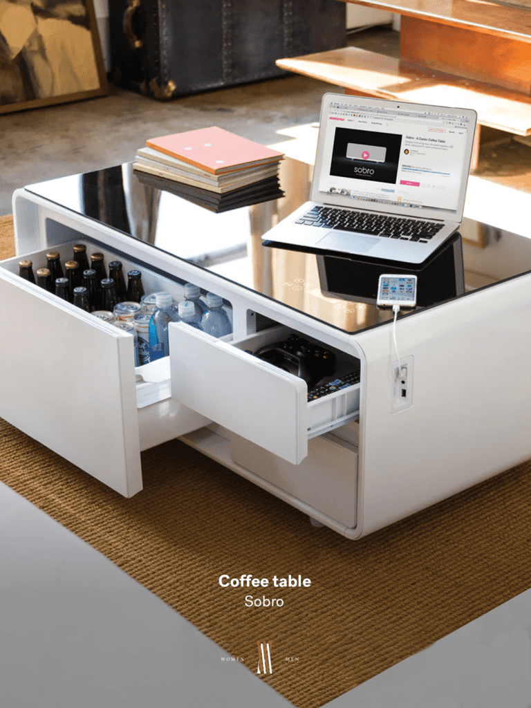 La propuesta de Sobro Design va más allá de un simple mueble: combina funciones tecnológicas con estética moderna. Sus mesas inteligentes (como mesa de café o lateral) incorporan cajones refrigerados, puertos de carga, altavoces Bluetooth y luces LED que crean ambiente. Esto significa que tu sala o recámara puede tener un centro de entretenimiento y confort con bebidas frías al alcance, música y carga para dispositivos sin agregar piezas por separado.