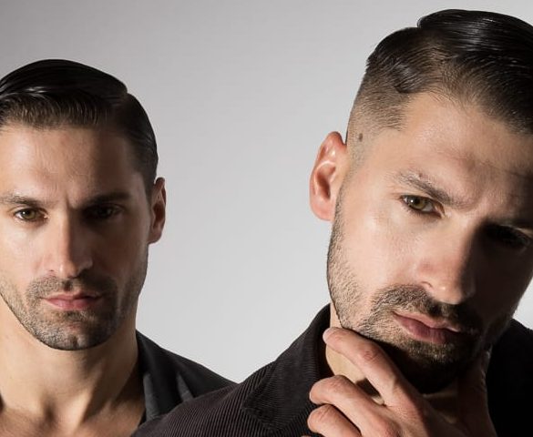 Dualidad y sofisticación en sintonía. Un despliegue de sastrería que resalta la elegancia masculina mediante texturas clásicas y una imponente presencia compartida.