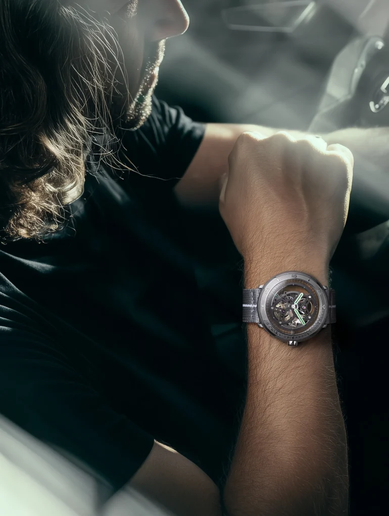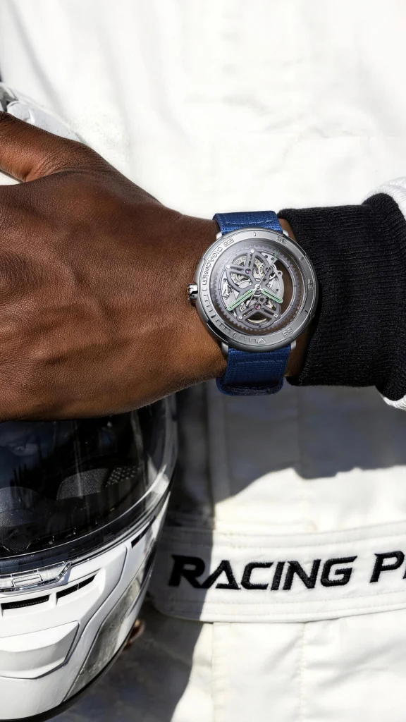 Inspirado en la disciplina del automovilismo, el reloj no busca imitar piezas de un coche, sino replicar la sensación de control y precisión de la alta competencia. Con un diámetro de 44.5 mm, la caja mantiene proporciones equilibradas para un reloj de su categoría.