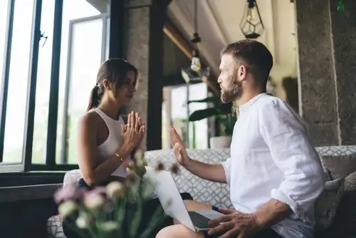 Hombre y mujer conversan frente a frente en un sofá, él con una laptop sobre las piernas y ella con las manos juntas en gesto de diálogo, en un ambiente interior con luz natural.