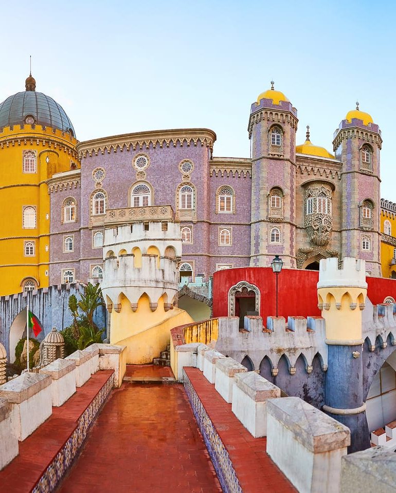 Pintado en rojos, amarillos y dorados sobre las colinas de Sintra, este palacio del siglo XIX es una oda al romanticismo arquitectónico. Cúpulas, azulejos y terrazas se combinan con la selvac y cielo. Una fantasía hecha piedra.