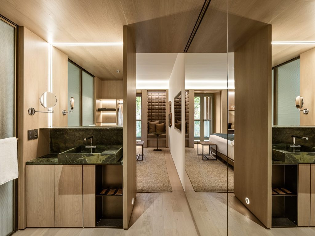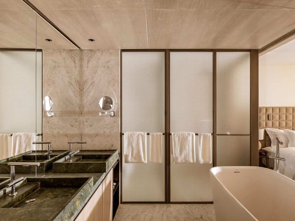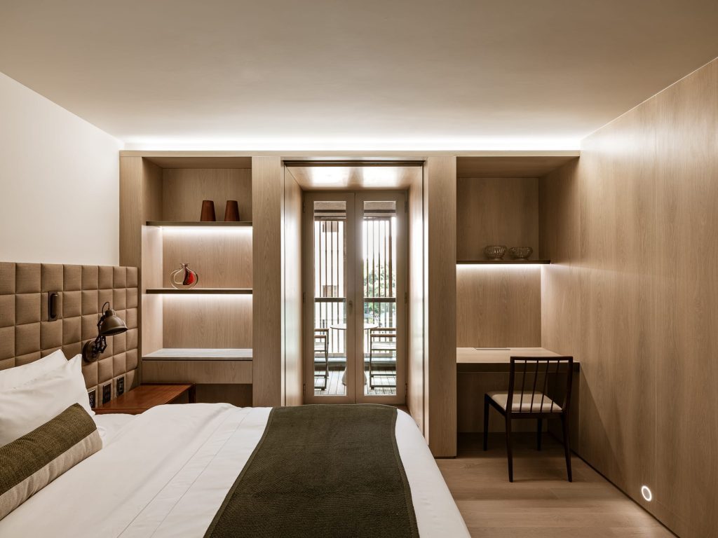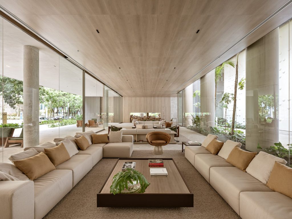 El proyecto forma parte del complejo mixto Praça Henrique Monteiro, donde residencias, gastronomía y hospitalidad coexisten en perfecta armonía. Según la arquitecta que trabaja con Arth­ur Casas, “ningún volumen es dominante; todos se integran con el entorno y la vegetación”. En la planta baja se amplía el paseo público con vegetación, generando un acceso sin barreras que convierte el lobby, el bar Sarau y el restaurante Charlô en espacios públicos de encuentro. Las 57 habitaciones de entre 32 y 64 m² cada una están curadas hasta el más mínimo detalle: muebles de diseñadores brasileños clásicos, piezas antiguas localizadas en mercados de Bixiga y una gama de materiales que evoca calma, con mármol veteado, madera natural y fibras tejidas.