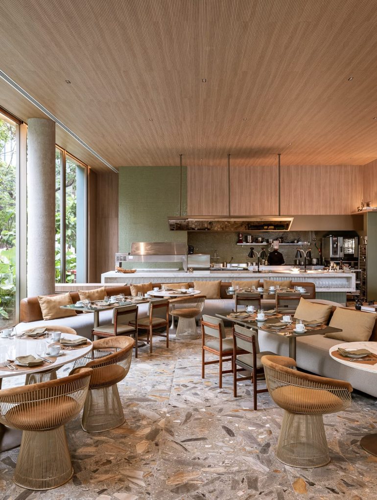 El proyecto forma parte del complejo mixto Praça Henrique Monteiro, donde residencias, gastronomía y hospitalidad coexisten en perfecta armonía. Según la arquitecta que trabaja con Arth­ur Casas, “ningún volumen es dominante; todos se integran con el entorno y la vegetación”. En la planta baja se amplía el paseo público con vegetación, generando un acceso sin barreras que convierte el lobby, el bar Sarau y el restaurante Charlô en espacios públicos de encuentro. Las 57 habitaciones de entre 32 y 64 m² cada una están curadas hasta el más mínimo detalle: muebles de diseñadores brasileños clásicos, piezas antiguas localizadas en mercados de Bixiga y una gama de materiales que evoca calma, con mármol veteado, madera natural y fibras tejidas.